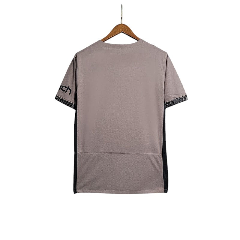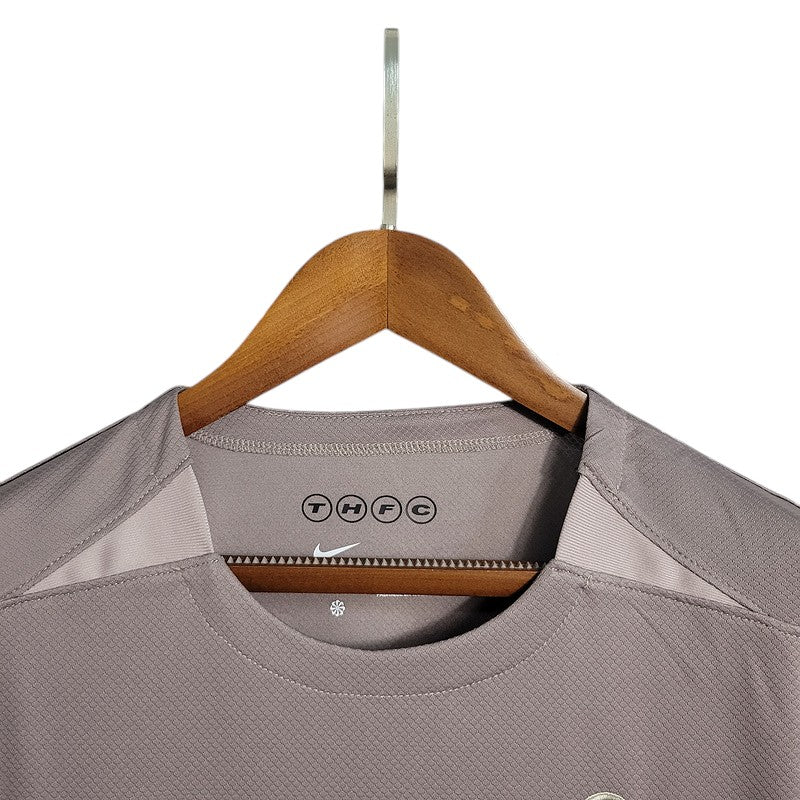 La tercera equipación del Tottenham Hotspur 2023/24, diseñada por Nike, presenta un diseño innovador en tono gris topo con detalles en negro, transmitiendo elegancia y modernidad. Con un enfoque minimalista y el escudo en monocromo, esta camiseta representa la versatilidad y ambición de los "Spurs". Durante esta temporada, el equipo busca dejar su huella en la Premier League y competiciones europeas, con figuras como Son Heung-Min, James Maddison y Cristian Romero liderando la plantilla.